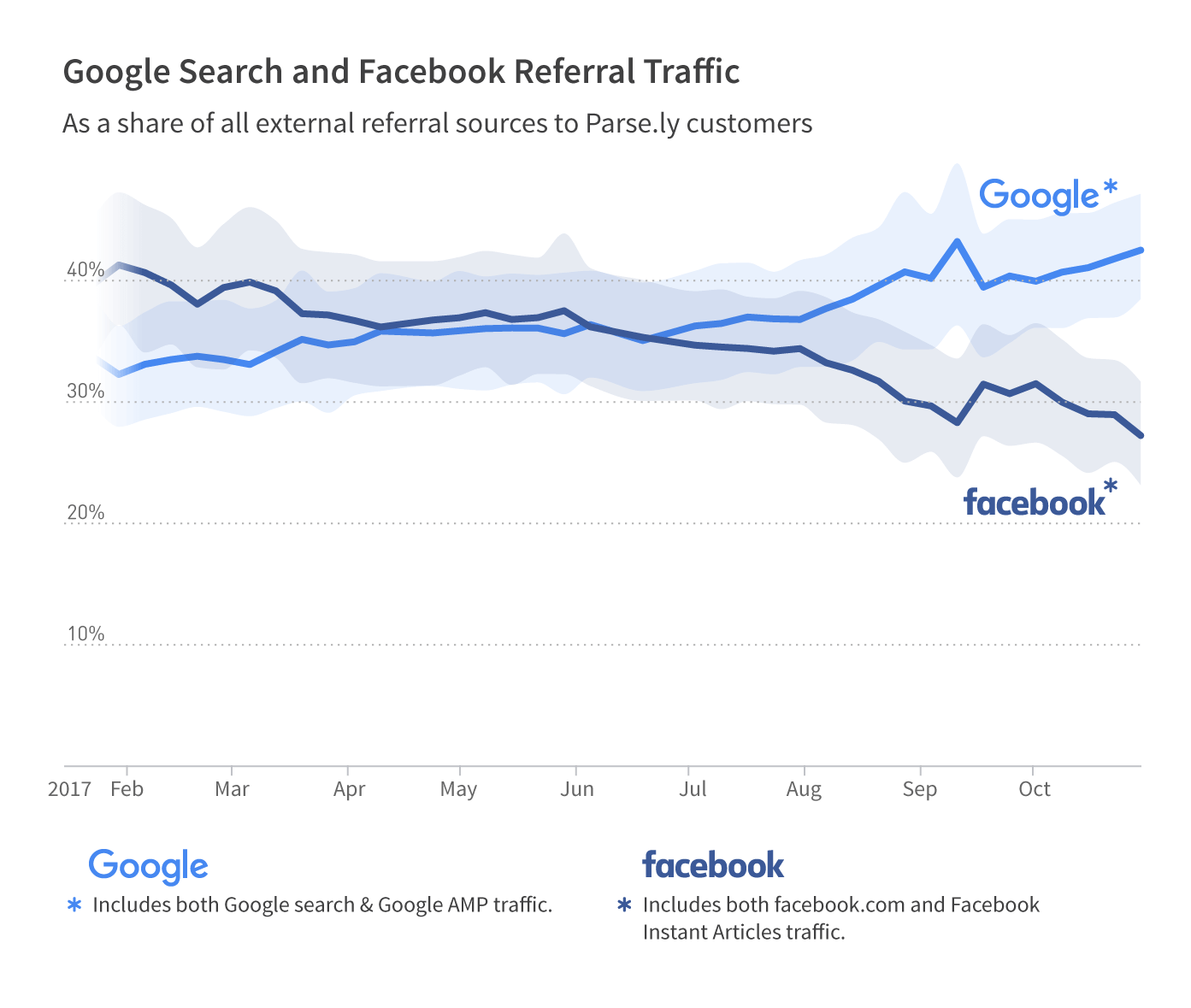 下面的两张图表,一个来自Shareaholic,另一个来自Parse.ly,在2017年的第三季度表明了2017年搜索与社交推荐流量类似的趋势。Parse.ly数据反映了来自Google(包括AMP - Google的加
