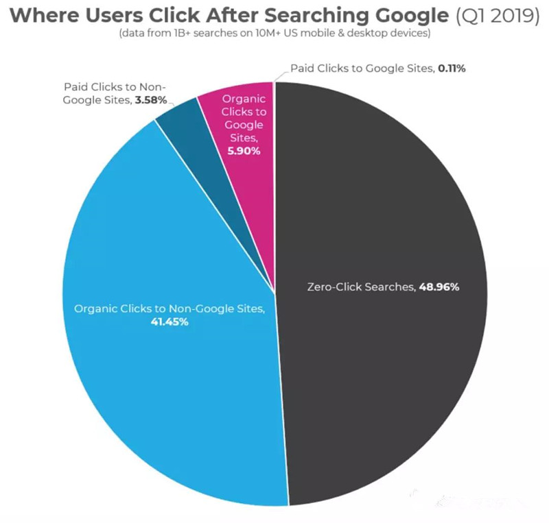 不过有个不好的消息就是2019年的第一季度,12%的自然流量流向了谷歌自家的产品,这对于过去几年的表现来说无疑是很大的变化了,但其实比例应该还更大,因为Jumpshot给出的这个数据只是基于chrome浏览器的谷歌搜索引擎数据。如果是用户使用的是google的app进行搜索,数据就有遗漏。